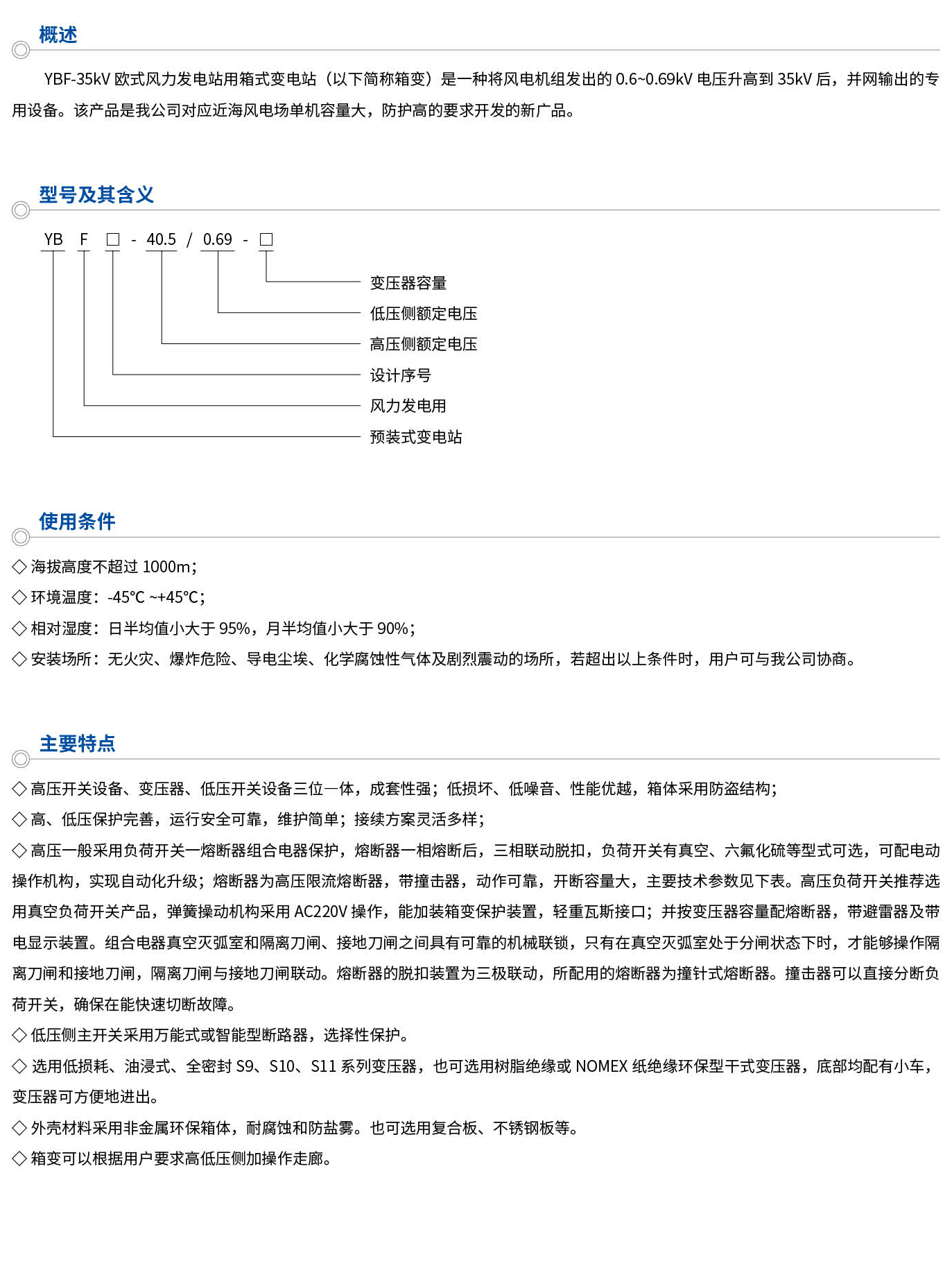 YBF-35kV欧式风力发电站用箱式变电站(以下简称箱变)是一种将风电机组发出的0.6~0.69kV电压升高到35kV后,并网输出的专用设备。该产品是我公司对应近海风电场单机容量大,防护高的要求开发的新产品。